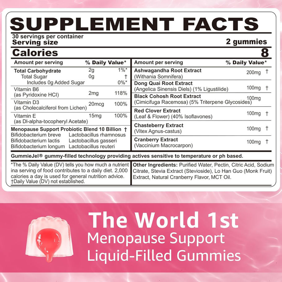 - 【Liquid-Filled Technology & Sugar-Free】GummieJel technology's dual-layer design features a protective pectin outer layer that shields against the elements, stabilizing the potency of herbs and nutrients and the activity of probiotics while enhancing absorption for effective and natural wellness. This pectin-based menopause gummy come in organic cranberry flavor and is free of GMOs, dairy, soy, binders, and yeast.