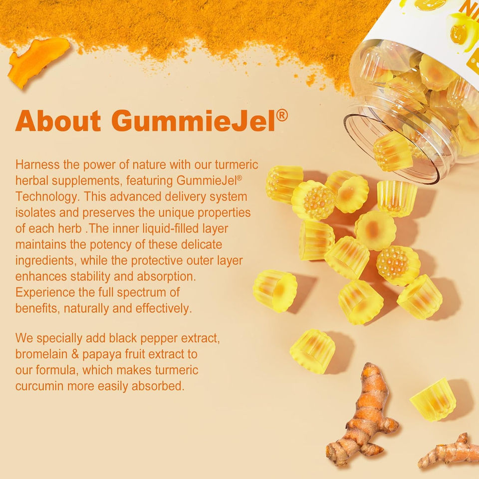 - [COMMITTED TO QUALITY]: Our turmeric supplement are 3rd party tested, proudly made in the USA in a GMP Certified Facility. GummieJel gummy-filled technology providing actives sensitive to temperature or ph based. If for any reason you're unhappy, we'll offer a full refund or replacement.