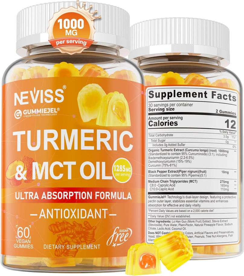 - 【Unique GummieJel Technology】Neviss turmeric gummies feature a gelatin-free chewy outer layer with a liquid center, preserving 98% curcumin activity. The inner liquid delivers curcumin, MCT oil, and black pepper extract in their most absorbable form, while the pectin shell shields them from pH, oxygen, and temperature effects. This innovative approach ensures optimal absorption and promotes overall vitality.