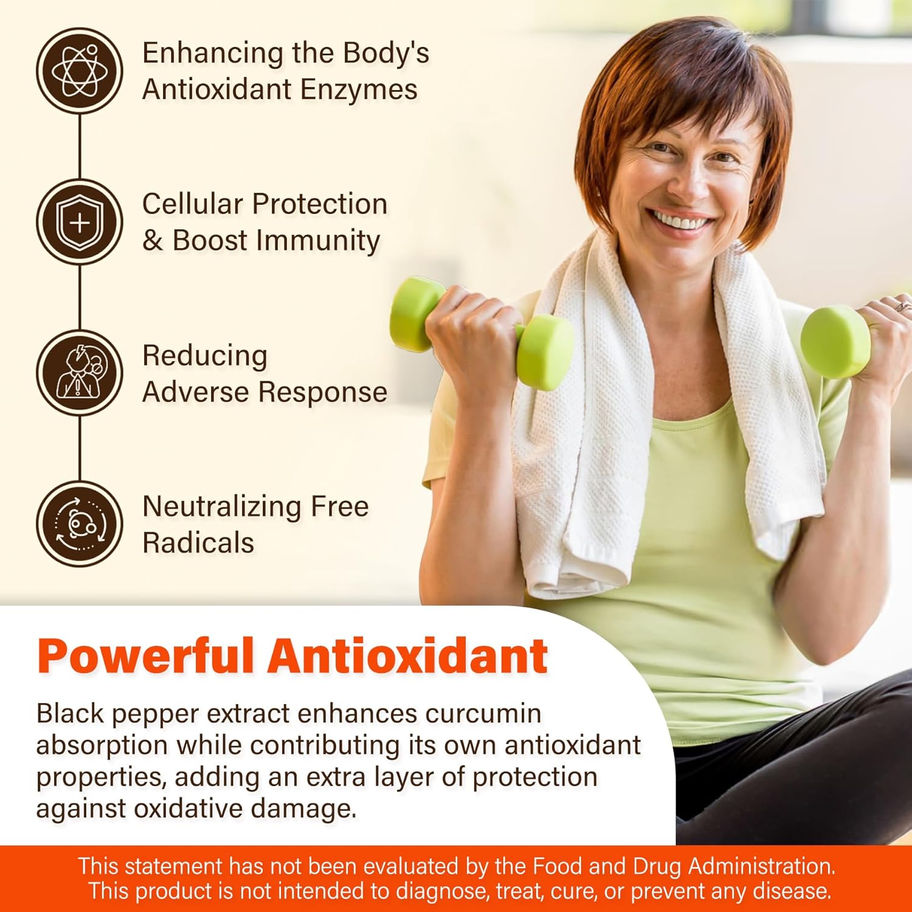 - 【POWERFUL ANTIOXIDANT】Curcumin and black pepper extract are rich in antioxidants, neutralizing harmful free radicals in the body. Combined with MCT Oil, our gummies promote a sustained release of curcumin into the bloodstream, prolonging its antioxidant effects. This powerful combination enhances the action of antioxidant enzymes that protect against cell damage, strengthening immune system, skin & brain health and supporting overall health.